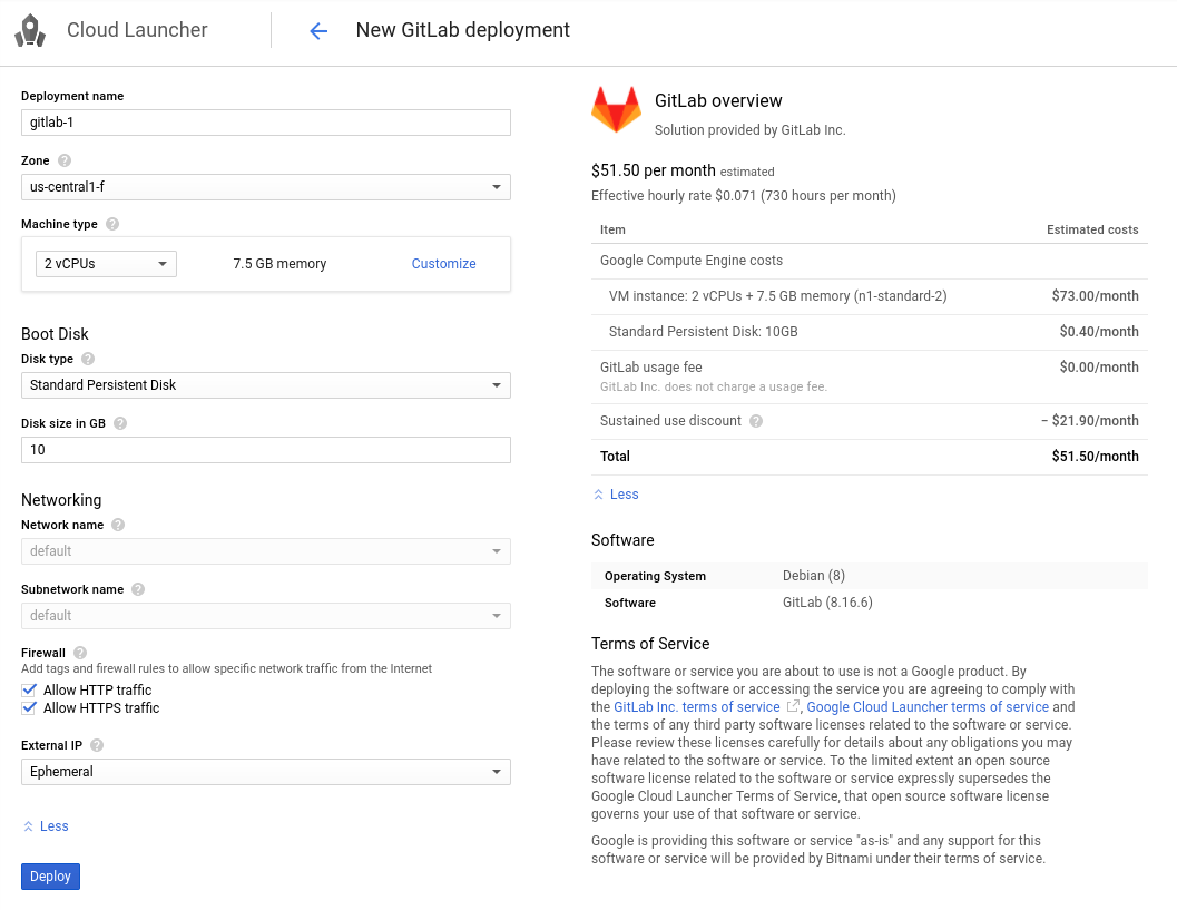 In the next page, you can see an overview of the GitLab VM as well as some estimated costs. Click the Launch on Compute Engine button to choose the hardware and network settings.
