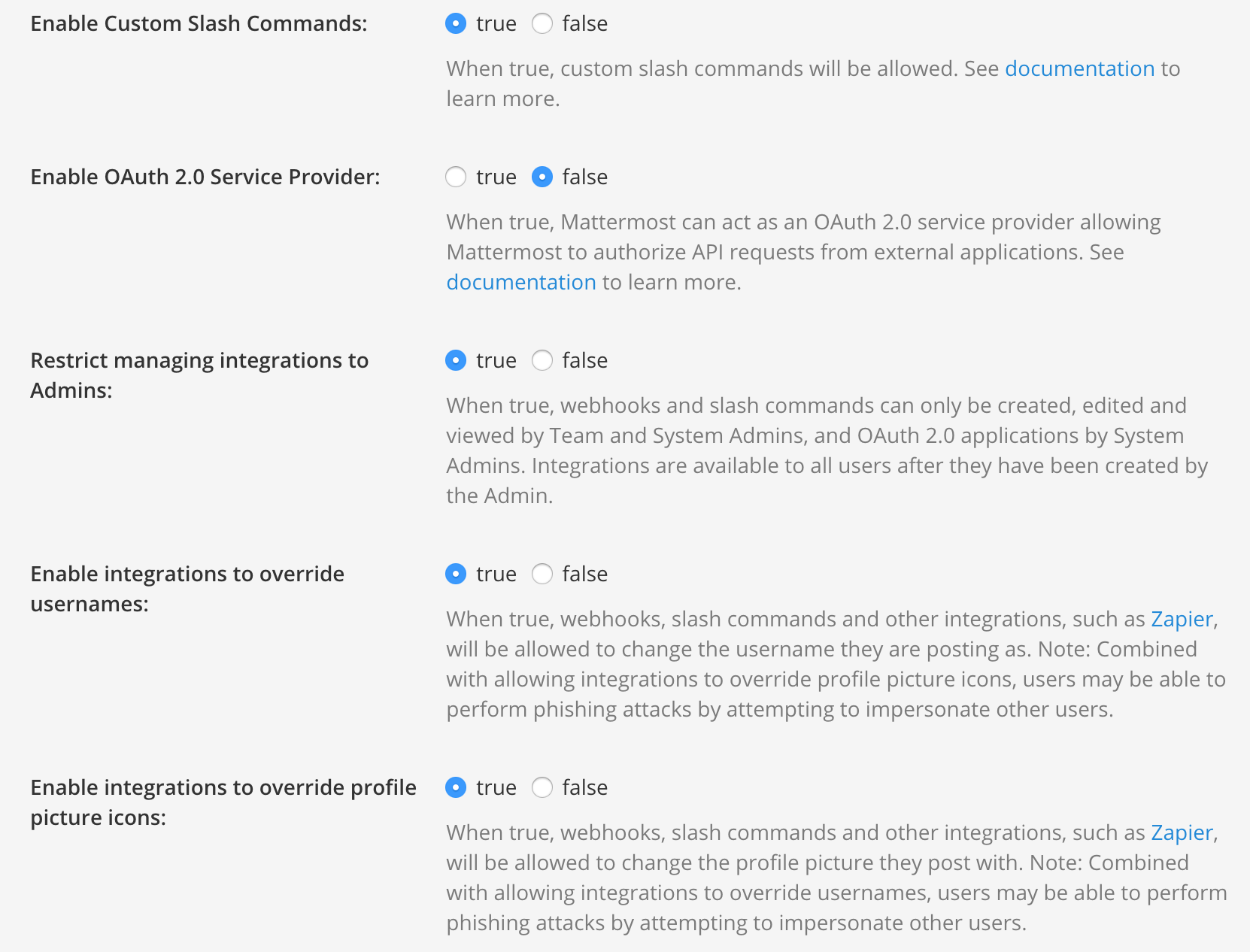 2. Click Custom integrations and set Enable Custom Slash Commands, Enable custom integrations to override usernames, and Override custom integrations to override profile picture icons to true